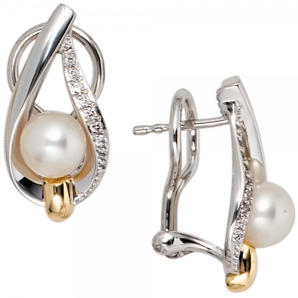 1 Paar Ohrstecker aus 14 Karat (585) Gold, Weißgold mit Gelbgold kombiniert, mit 2 Süßwasser-Zuchtperlen und 18 Diamant-Brillanten, 0,11 ct., W/SI wesselton (weiß), SI=(kleine, mit bloßem Auge nicht erkennbare natürliche Einschlüsse), Feinbearbeitung gut, mit Omegaverschluss, Durchmesser der Perlen ca. 6 - 6,5 mm, Höhe ca. 20,7 mm, Breite ca. 10,1 mm, Gewicht ca. 6,8 g * Bitte beachten Sie die Maße! Auf dem Foto kann der Artikel größer wirken *