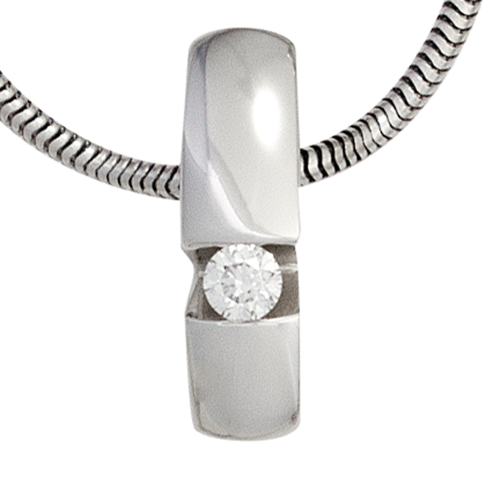 Anhänger aus 14 Karat (585) Weißgold mit einem Diamant-Brillanten, 0,10 ct., W/SI wesselton (weiß), SI=(kleine, mit bloßem Auge nicht erkennbare natürliche Einschlüsse), Feinbearbeitung gut, Höhe ca. 15,7 mm, Breite ca. 4,4 mm, Tiefe ca. 5,5 mm, Innenmaße der öse ca. 5 mm x 2,4 mm, Gewicht ca. 2,1 g * Bitte beachten Sie die Maße! Auf dem Foto kann der Artikel größer wirken *
