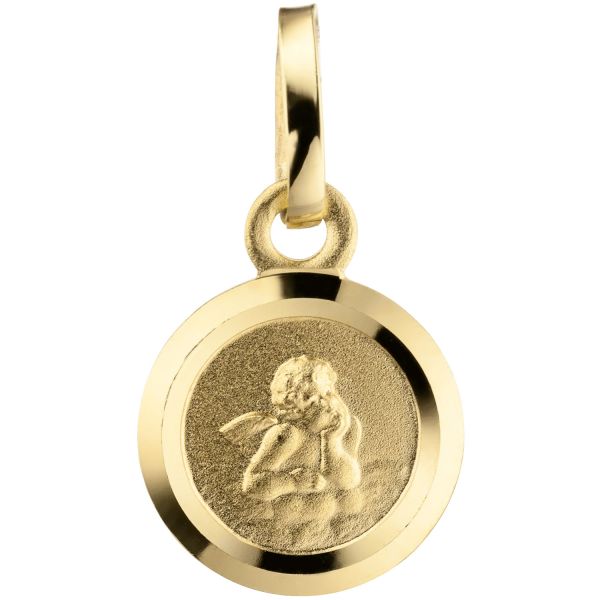 Anhänger 'Schutzengel' aus 8 Karat (333) Gelbgold, teilmattiert, Rückseite mit Prägung 'Gott schütze Dich', Durchmesser ca. 8,1 mm, Tiefe ca. 0,8 mm, Innenmaße der öse ca. 3,6 mm x 2,1 mm, Gewicht ca. 0,3 g * Bitte beachten Sie die Maße! Auf dem Foto kann der Artikel größer wirken *